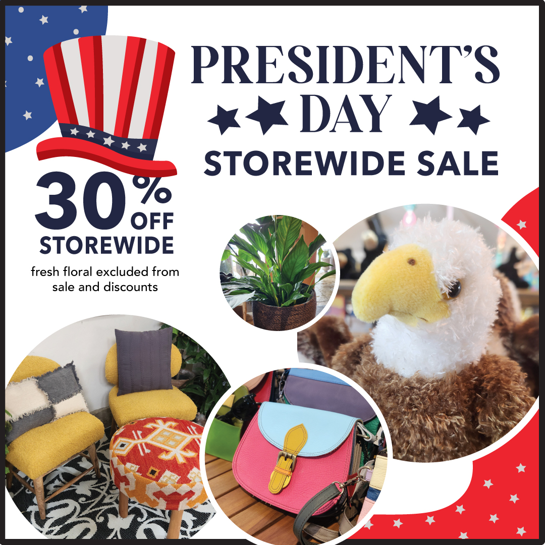 Happy President's Day! Come shop our 30% off storewide sale including houseplants, toys, home decor, garden tools, paper goods, gifts and so much more. Our sale ends on 2/21 so stop by before then between the hours of 9am-6pm.