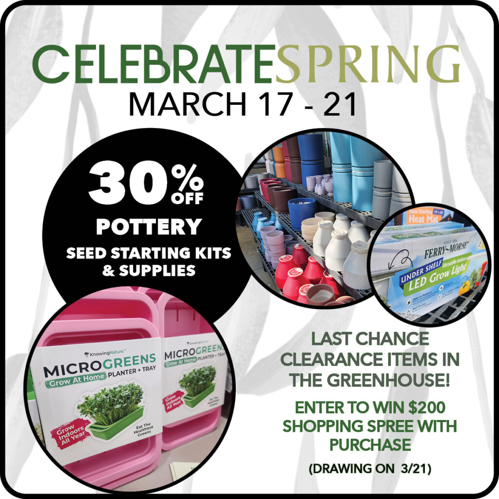 We also have last-chance items in the greenhouse available at special sale prices. Plus, when you make a purchase, you’ll be entered to win a $200 shopping spree! The drawing for that will be March 21.